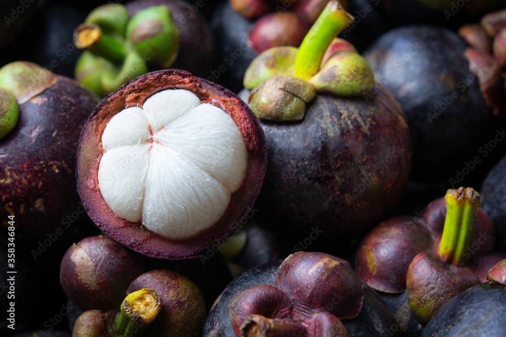 Fresh ripe mangosteen. Queen of fruit in Thailand. Showing the thick purple skin and white flesh
