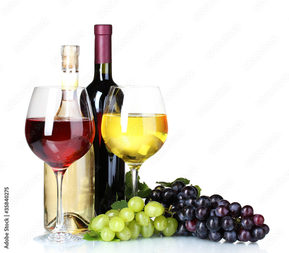 Ripe grapes, wine glasses and bottles of wine isolated on white