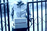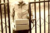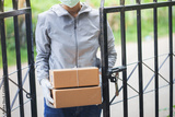 Delivery woman holding shopping box and medical rubber gloves and mask .