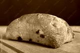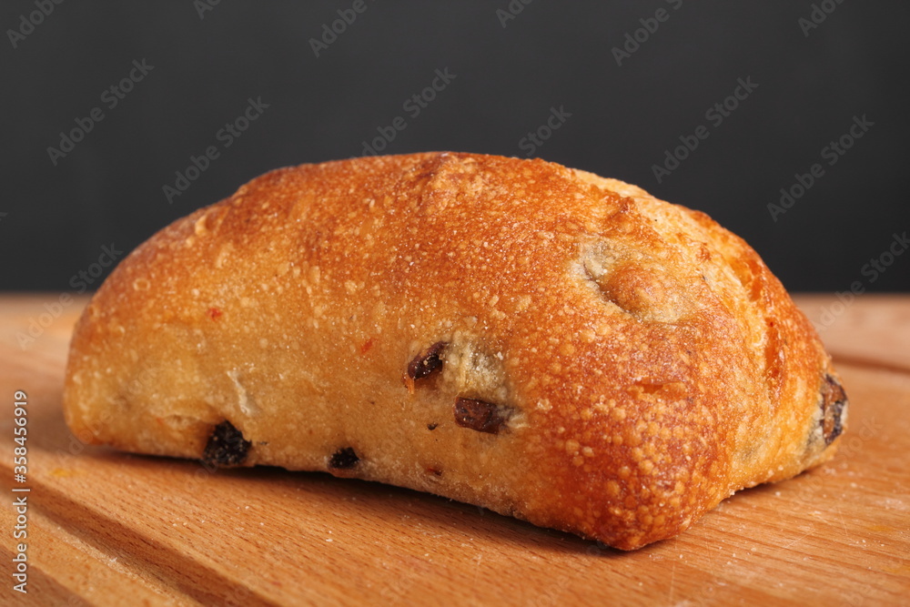 Ciabatta with black olives. Italian white bread.