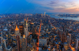 New York Downtown and lower Manhattan skyline view with the One World Trade Center skyscraper at sunset