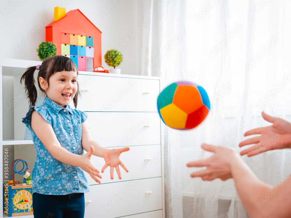 children little girl play in a children's game room, throwing ball. concept of interaction parent and kid