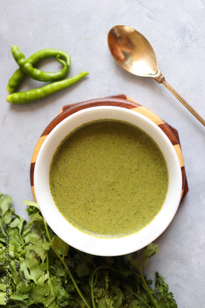 Spicy and tasty Coriander Mint Green Chutney. Hara Dhaniya Chutney, Coriander Dip. Healthy dips. along with spices and copy space.