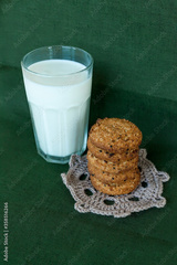 Stack of Chocolate chip cookie and glass of milk.