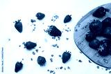 .Scattered strawberries with oatmeal ganuls on a white plate next to a cutting board.