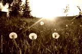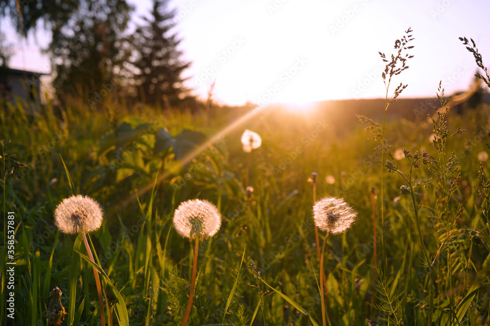 Dandelions in the grass at sunset in the village. White dandelions in golden rays in the evening sunlight. Countryside nature landscape background.
