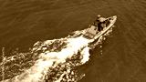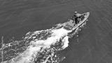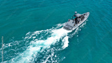 Aerial drone photo of luxury inflatable speed boat cruising in deep blue Aegean sea, Mykonos island, Cyclades, Greece