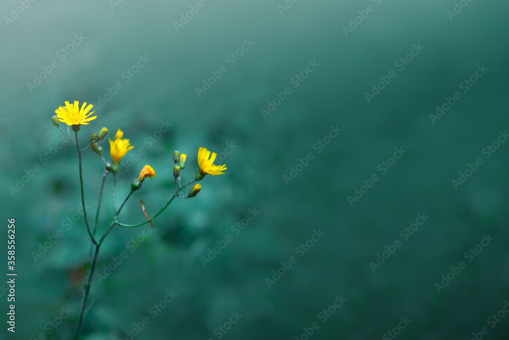 Delicate yellow buttercup wildflowers isolated on green blur background.
