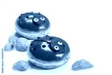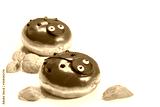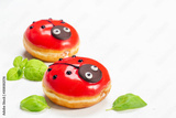 Fried donuts filled with cream glazed with sugar icing as ladybugs. Whire background. Copy space. Text box.