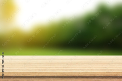 Wood floor with blurred trees of nature park background and summer season, product display montage