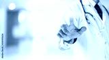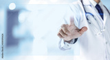 Doctor pointing finger on touch screen monitor.