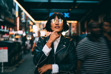 Youthful female traveller in stylish spectacles for vision correction spending time for walking around metropolitan downtown and explore New York nightlife on leisure, young woman in streetwear