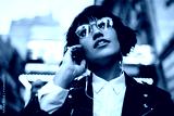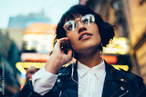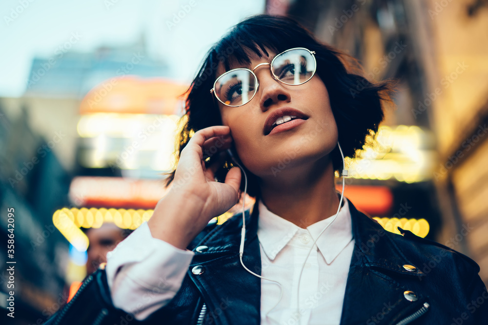Attractive hipster girl in stylish apparel strolling on urban settings listening to music in earphones, good-looking woman in spending time on city street with night illumination enjoying playlist.