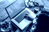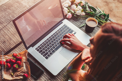 Workspace with girl's hands, laptop computer, bouquet of peonies flowers, coffee, strawberries, smartphone on rough wooden table. Freelancer working in outdoor park. Top view office desk. Flat lay