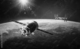 Spaceship and ISS station on orbit of the Earth planet. Outer space. Elements of this image furnished by NASA