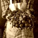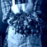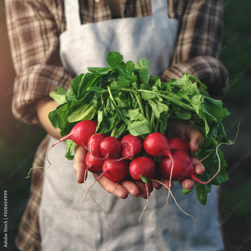 Farmers holding fresh radish in hands on farm. Woman hands holding freshly bunch harvest. Healthy organic food, vegetables, agriculture, close up