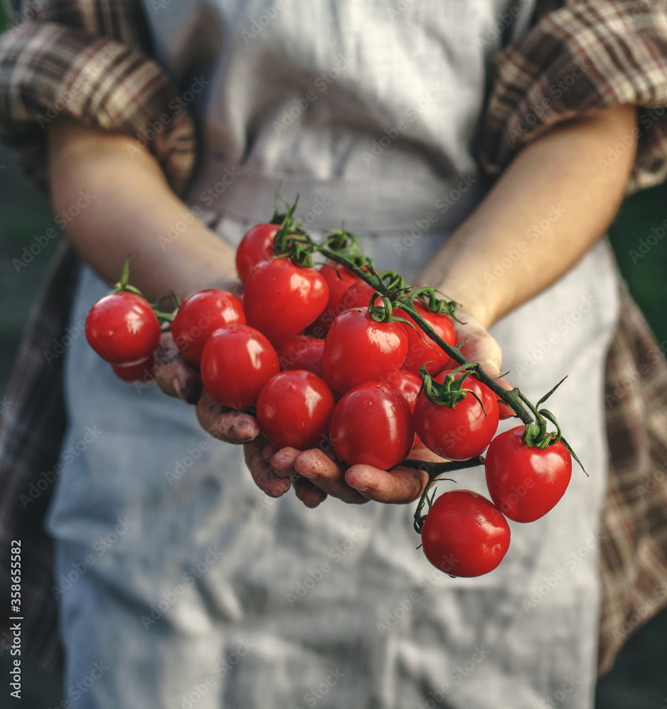 Farmers holding fresh tomatoes in hands on farm at sunset. Woman hands holding freshly harvest. Healthy organic food, vegetables, agriculture, close up