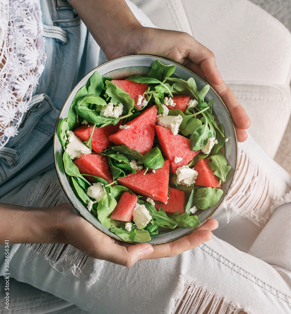 Woman in jeans eating fresh summer watermelon salad with feta cheese, arugula, spinach and greens on light background. Healthy food, clean eating, Buddha bowl salad, top view