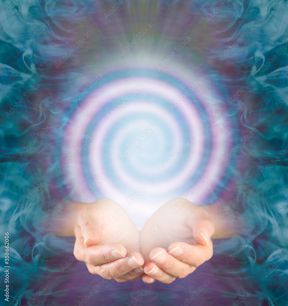 Observe the continuous vortexing spiral of energy flowing in and out - female cupped hands with a pink spiral above against an intricate jade green purple energy background and copy space