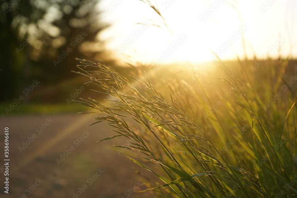 Grass by the road at sunset. The golden rays of the sun shine through the green grass. Countryside landscape background.