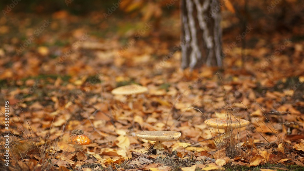 Toadstools in the autumn forest among fallen leaves and grass, autumn forest, copy space