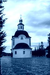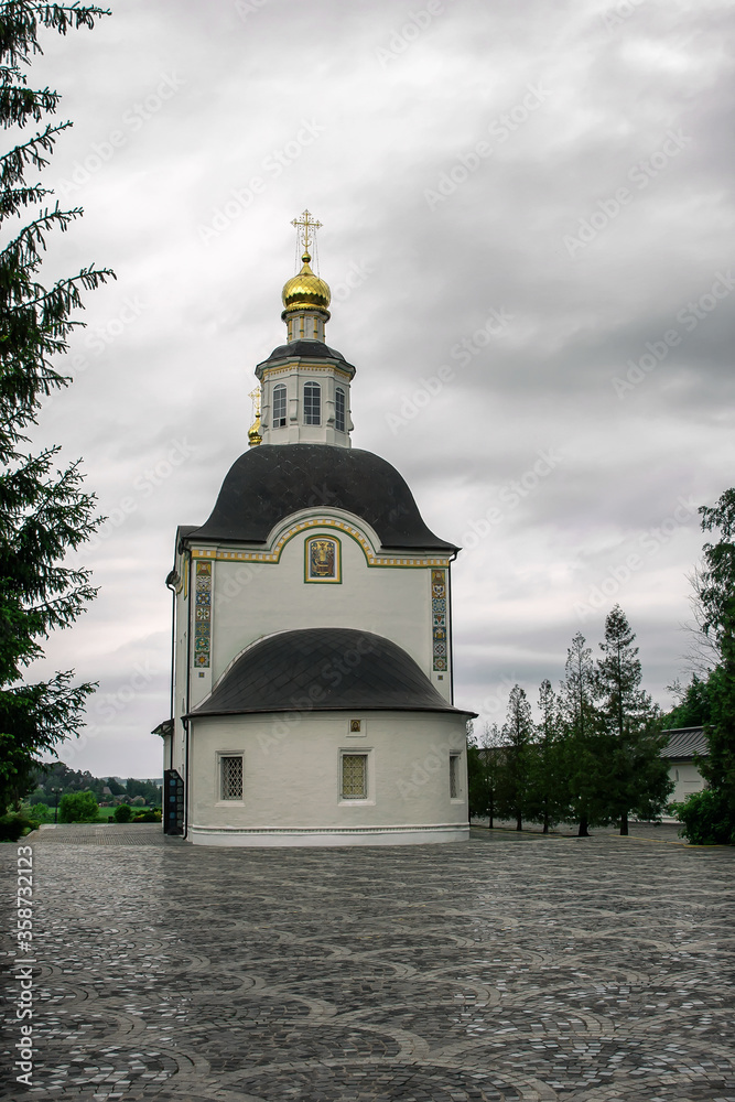 Little beautiful white orthodox church under a gray sky