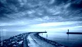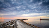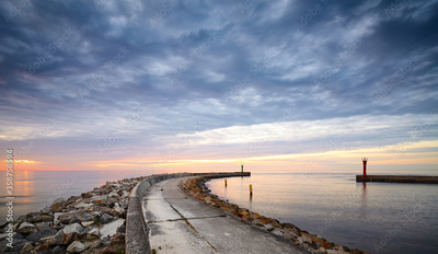 Panoramic view of rocky pier at the entrance to the harbor at sunset.