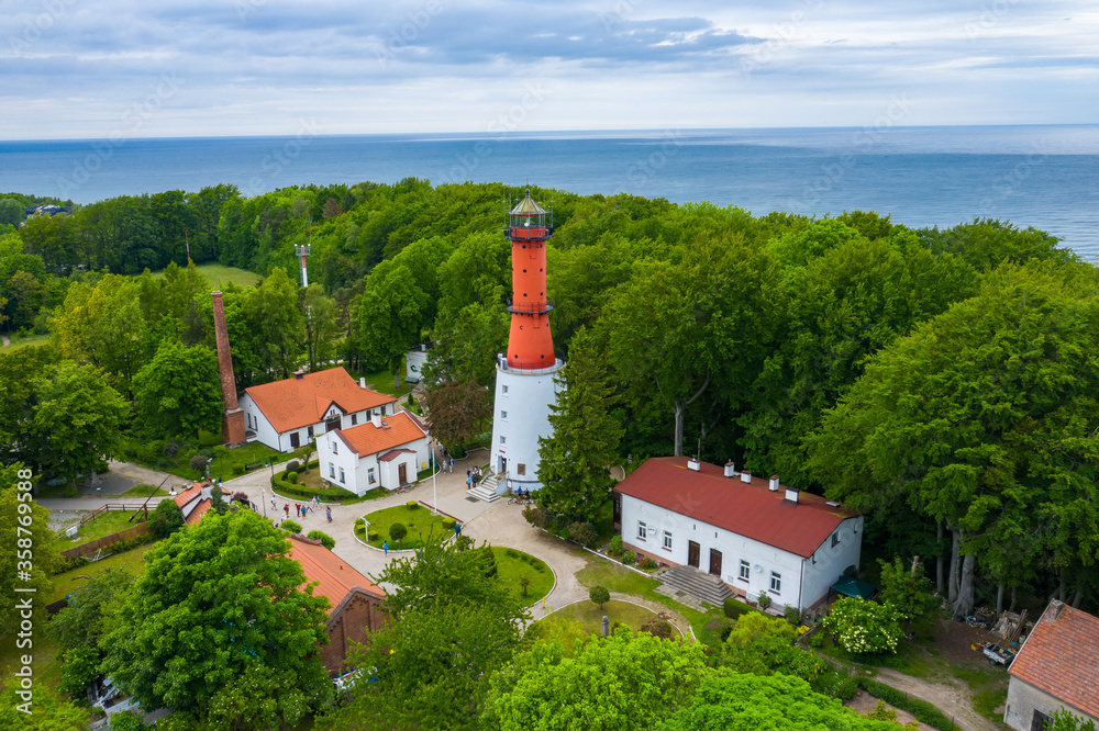 Aerial view of lighthouse in the small village of Rozewie on the Polish seashore of the Baltic Sea. Poland. Europe.