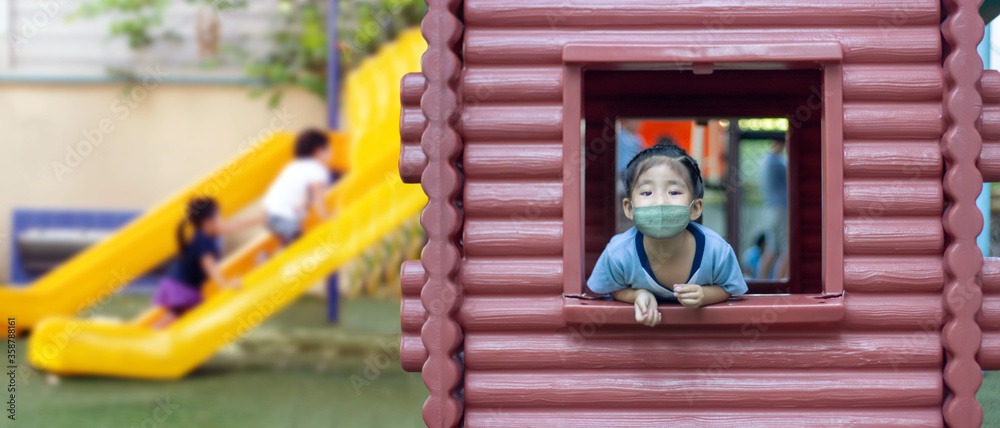 kid play outdoor with mask when back to school after coronavirus pandemic