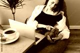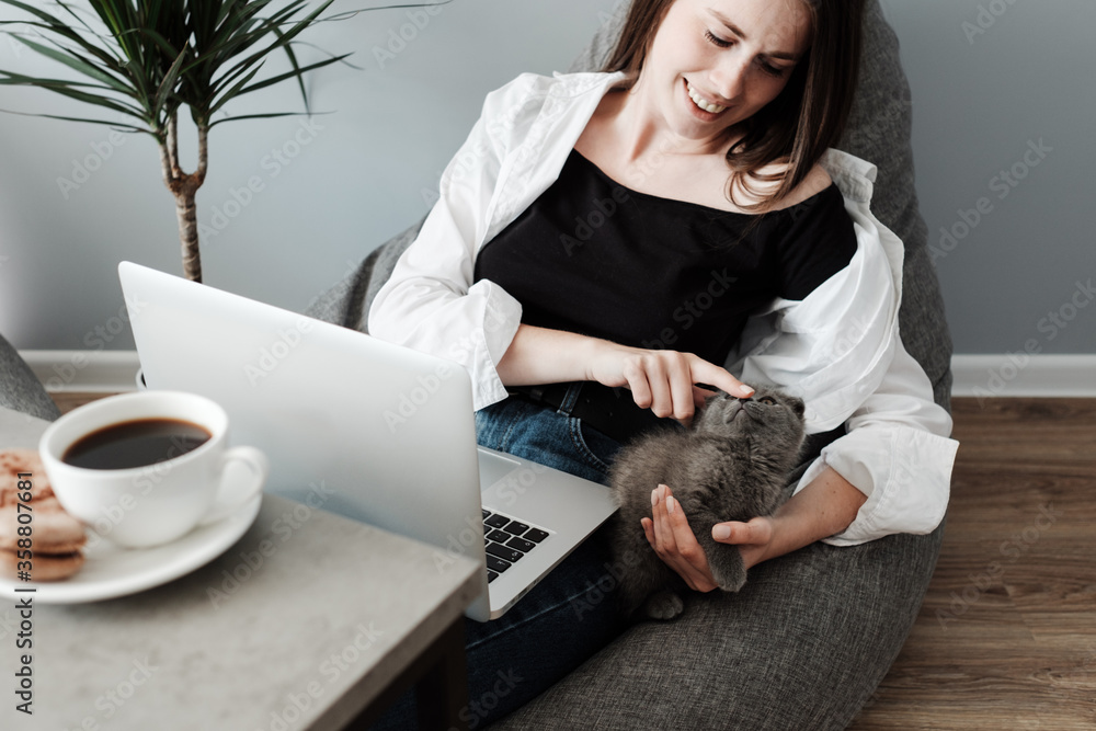 Young Adult Girl Working at Laptop from Home and Plays with Her Little Scottish Fold Cat, Concept of Remote Work, Freelance