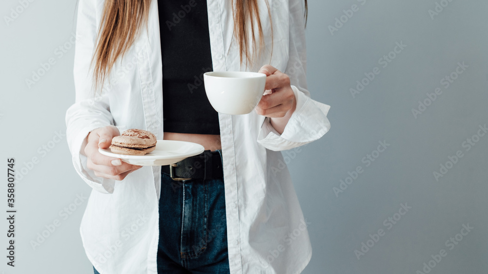 Girl in White T-shirt and Jeans Holds Cup of Coffee and Plate of French Macarons