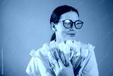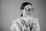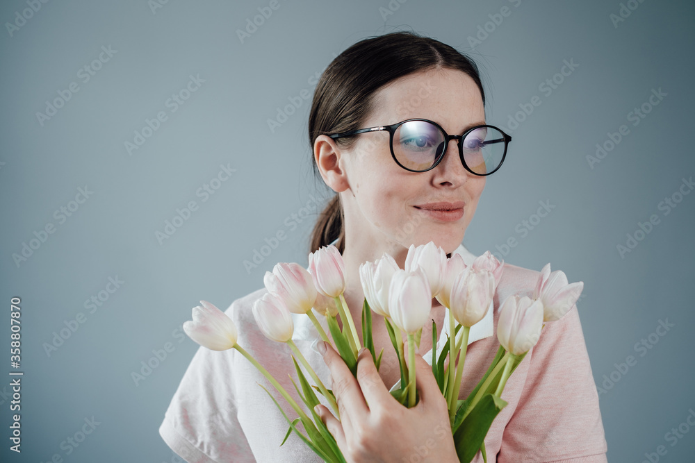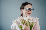 Studio Portrait of Young Adult Pretty Girl with Glasses Dressed in Pink T-shirt Holds Bouquet of Fresh Tulips