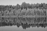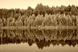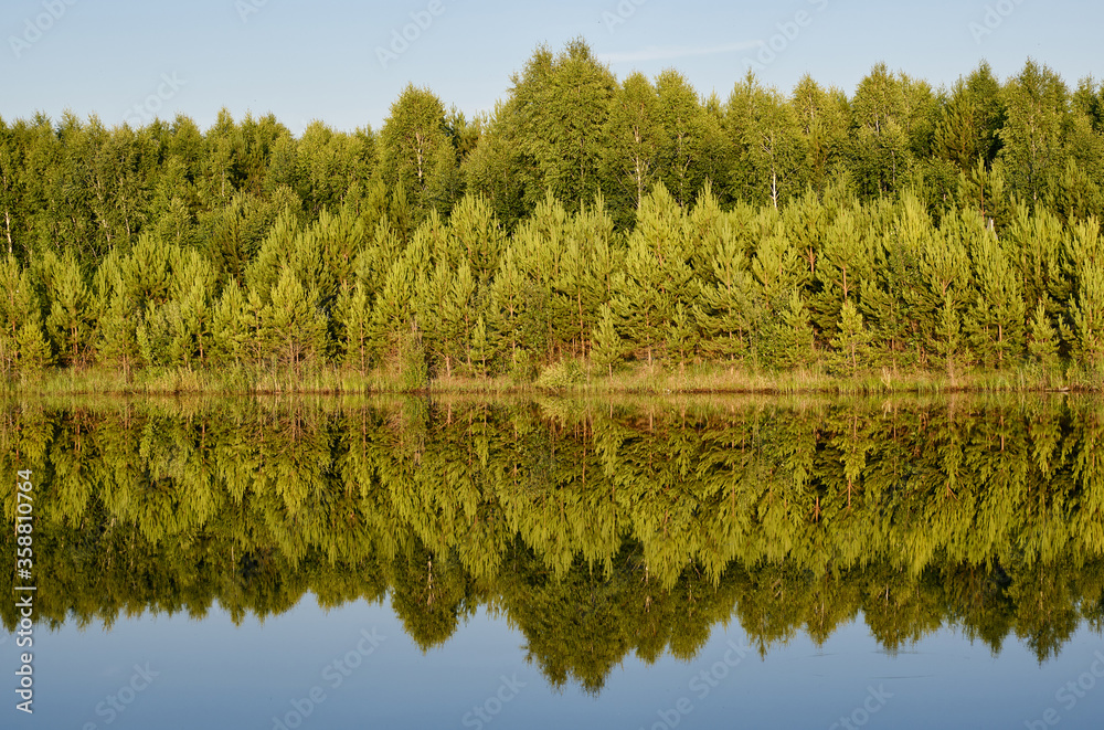 Rows of pines and birches standing are symmetrically reflected on the surface of the water.