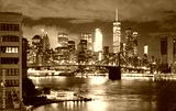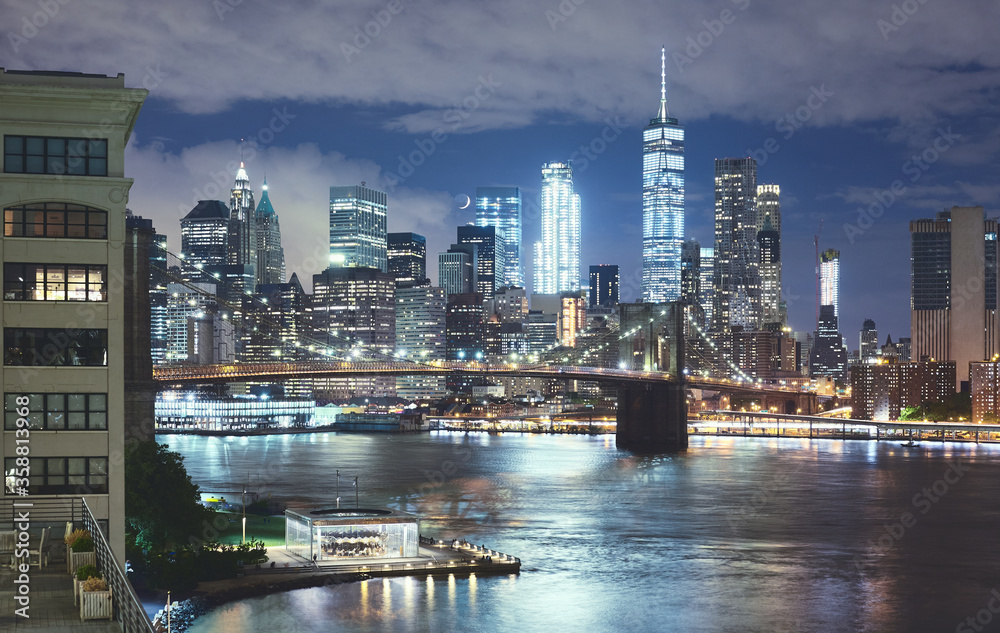 New York cityscape at night, Brooklyn Bridge and Manhattan seen from Brooklyn Dumbo, color toning applied, USA.