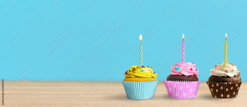Birthday cupcakes with burning candles on the table and blue wall background