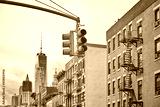 Retro toned picture of New York City traffic lights, selective focus, USA.