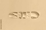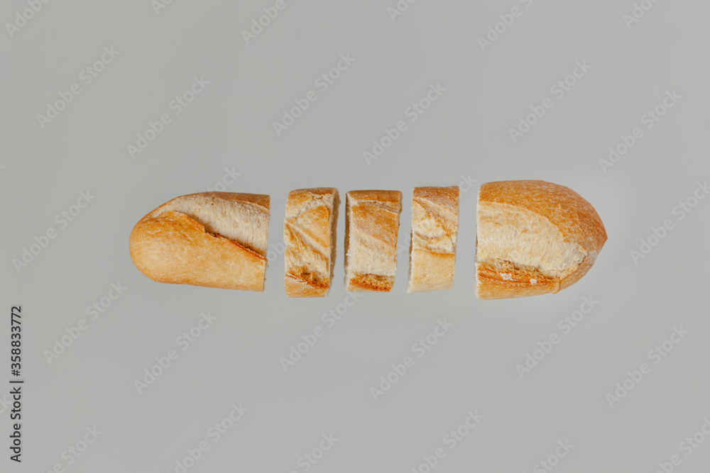 A flat lay of a baguette bread cut up on a light pastel grey background