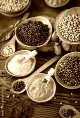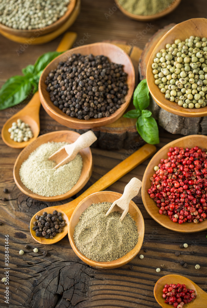 Various colorful peppercorns in the bowls and spoons on wooden table.