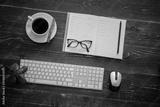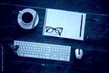 Minimalistic composition of office items top view. Objects are beautifully laid out on a dark wooden table. Copy space. Keyboard, glasses, notebook, pencil, cup of coffee, computer mouse. Horizontal.