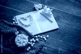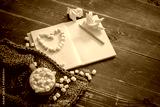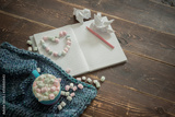 Romantic background with a cup of hot drink, marshmallows, a heart made of small sweets, a notebook. Crumpled sheets. Copy space. Concept of love, loneliness, wedding, planning.