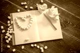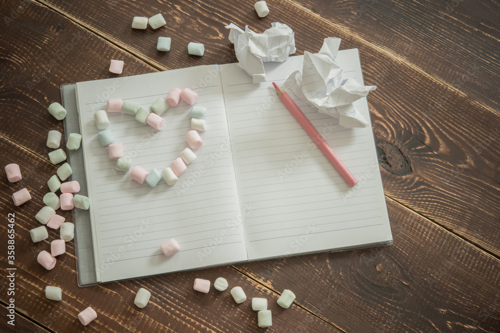 Romantic background with a notebook, pencil, marshmallows, heart made of small sweets. Crumpled sheets. Copy space. Concept of love, Valentine's Day, loneliness, relationships, wedding, making wishes.