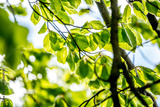 Beautiful Spring leaves with bokeh lights in the Spring forest, natural backgound for Spring projects.;