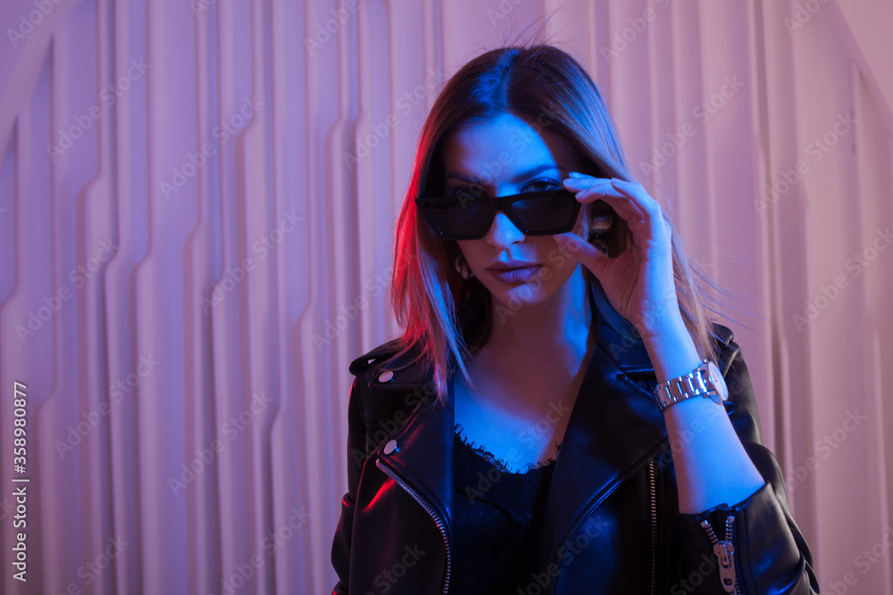 Beautiful girl dancing in retro wave on the neon light