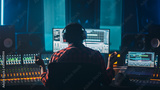 Artist, Musician, Audio Engineer, Producer in Music Record Studio, Uses Control Desk with Computer Screen showing Software UI with Song Playing. Success with Raised Hands, Dances. Back View.