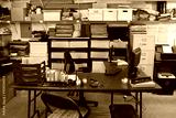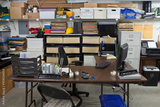 Messy garage warehouse shipping office with boxes, files and clutter.