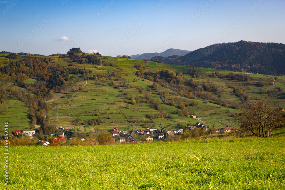 Village Lomnica-Zdroj in southern Poland. Beskid Sadecki Mountains in autumn.
