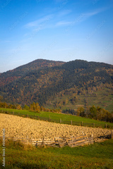 Plowed field and Parchowatka and Laziska Mountains near village Lomnica-Zdroj, Poland. Beskid Sadecki in Autumn.