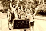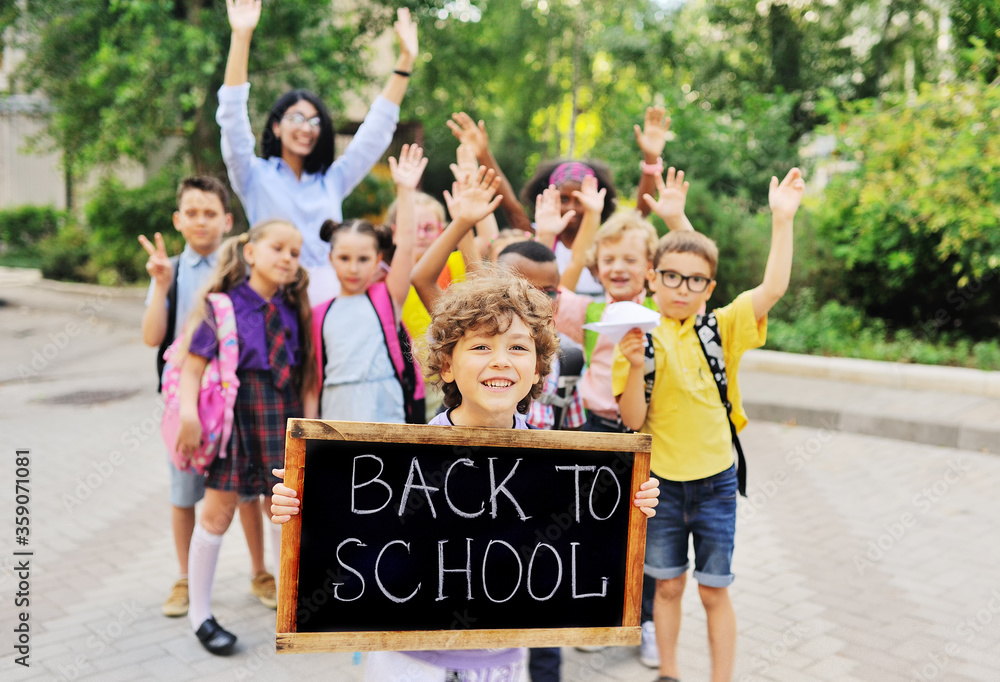 little schoolboy with curly hair on the background of a group of children classmates holding a sign with the inscription "back to school."