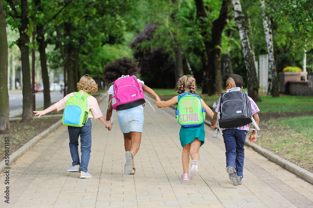 a group of school children of different races in colorful clothes with school bags and backpacks run to school against the background of green m Park. Back to school, knowledge day,