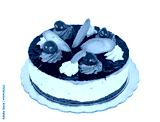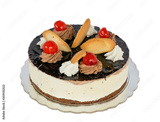 Chocolate ice cream cake with cherries and biscuits isolated.